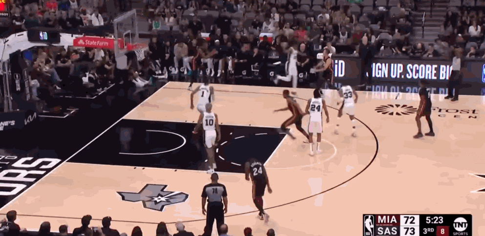 然后,场面非常混乱:查尔斯·奥克利找不到任何人接球,米勒后冲向格雷格安东尼,两人进而产生肢体接触,后者倒地,更不妙的是,梅森的手中球如同惯性般传了出来安东尼倒下了,奥克利莫名其妙的把球传给了雷吉米勒。雷吉控住球,本能地在三分线后面投篮,并从同一个位置投进又一个三分球。